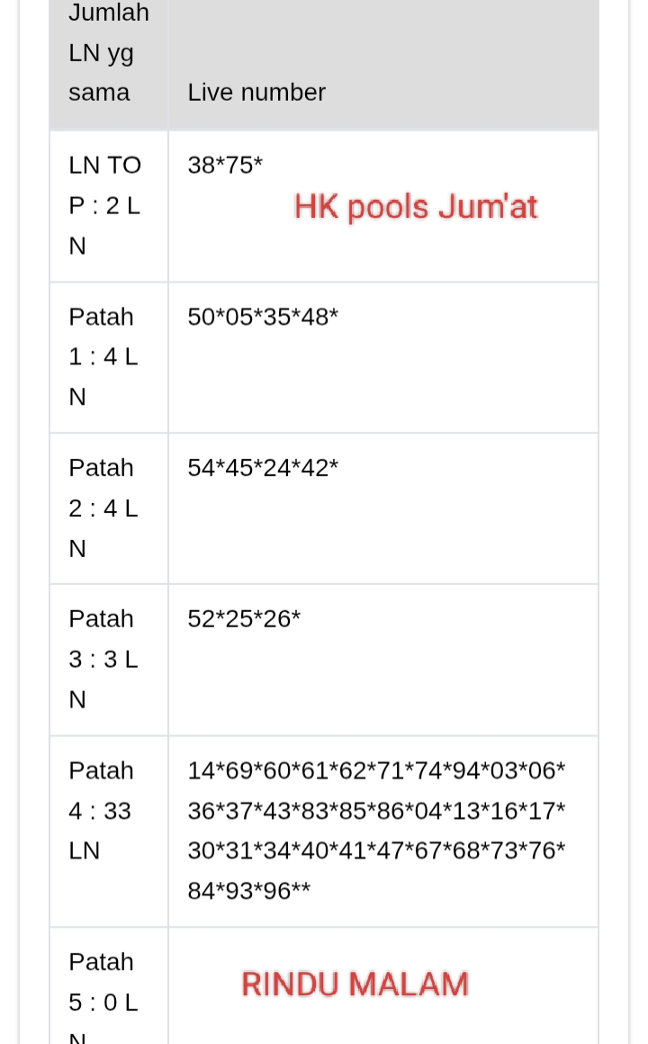 Prediksi HK Jumat, 03-10-2025 Merupakan Prediksi Otomatis yang menggabungkan Metode Kalender Togel Dengan LN Generator yang akurasi prediksinya sudah kita ketahui bersama. Jadi harap Maklum Jika kadang meleset Prediksi HK kita. Jadikan ini sebagai perbandingan saja dan tetap Utamakan karya sendiri