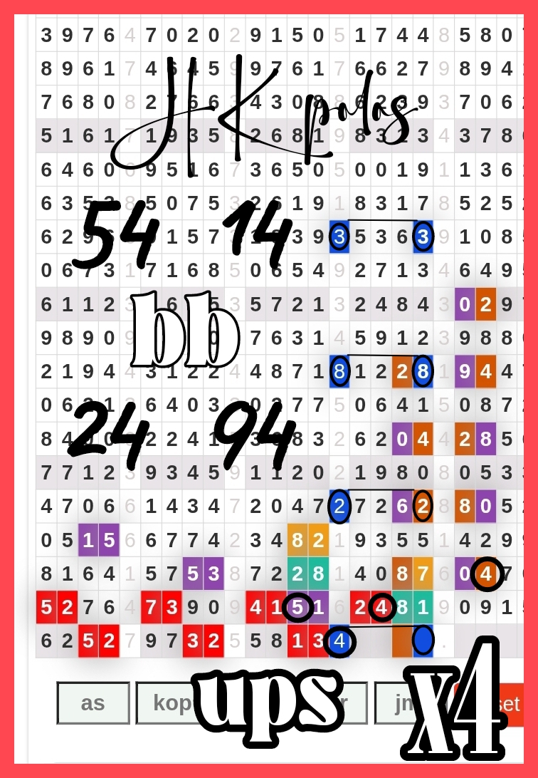 Rumus Angka Mati berdasarkan kepala harian | 05 06 08 10 15 16 17 18 19 20 21 26 27 28 29 30 32 37 38 39 40 41 43 48 52 53 54 63 64 65 74 75 76 86 87 94 95 97 98 |