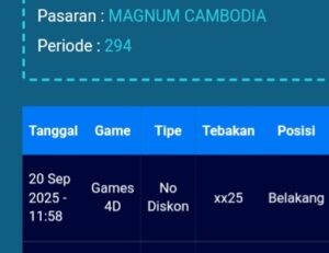 Prediksi Magnum Cambodia Kamis, 02-10-2025 Merupakan Prediksi Otomatis yang menggabungkan Metode Kalender Togel Dengan LN Generator yang akurasi prediksinya sudah kita ketahui bersama. Jadi harap Maklum Jika kadang meleset Prediksi Magnum Cambodia kita. Jadikan ini sebagai perbandingan saja dan tetap Utamakan karya sendiri