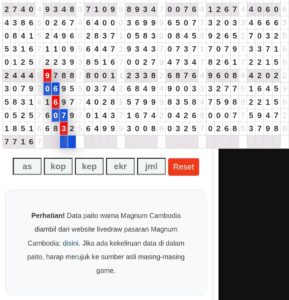Prediksi Magnum Cambodia Kamis, 02-10-2025 Merupakan Prediksi Otomatis yang menggabungkan Metode Kalender Togel Dengan LN Generator yang akurasi prediksinya sudah kita ketahui bersama. Jadi harap Maklum Jika kadang meleset Prediksi Magnum Cambodia kita. Jadikan ini sebagai perbandingan saja dan tetap Utamakan karya sendiri