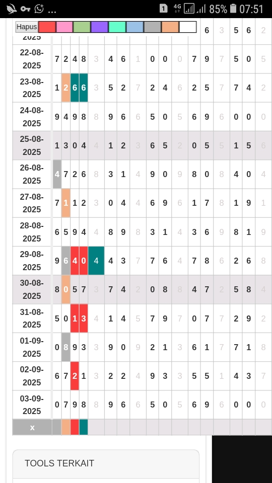 Rumus Angka Mati berdasarkan kepala harian | 07 08 09 10 18 19 20 21 29 31 32 40 42 43 49 50 51 53 60 61 62 63 64 65 71 72 73 74 75 76 82 83 84 85 87 93 95 96 98 |