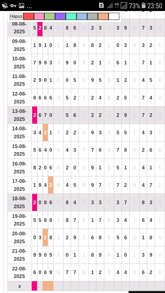 Rumus Angka Mati berdasarkan kepala harian | 04 05 06 07 08 09 10 15 16 17 18 19 21 26 27 28 29 30 32 37 39 41 42 43 52 53 54 63 64 65 75 76 83 84 86 87 94 95 97 |