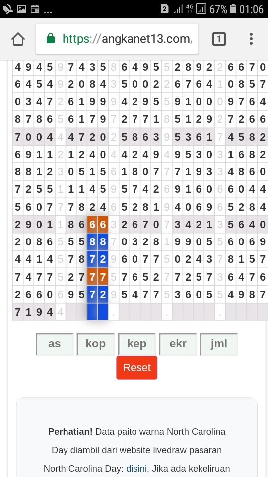Prediksi North Carolina Day Jumat, 03-10-2025 Merupakan Prediksi Otomatis yang menggabungkan Metode Kalender Togel Dengan LN Generator yang akurasi prediksinya sudah kita ketahui bersama. Jadi harap Maklum Jika kadang meleset Prediksi North Carolina Day kita. Jadikan ini sebagai perbandingan saja dan tetap Utamakan karya sendiri