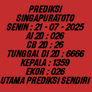 Prediksi Singapore Rabu, 01-10-2025 Merupakan Prediksi Otomatis yang menggabungkan Metode Kalender Togel Dengan LN Generator yang akurasi prediksinya sudah kita ketahui bersama. Jadi harap Maklum Jika kadang meleset Prediksi Singapore kita. Jadikan ini sebagai perbandingan saja dan tetap Utamakan karya sendiri