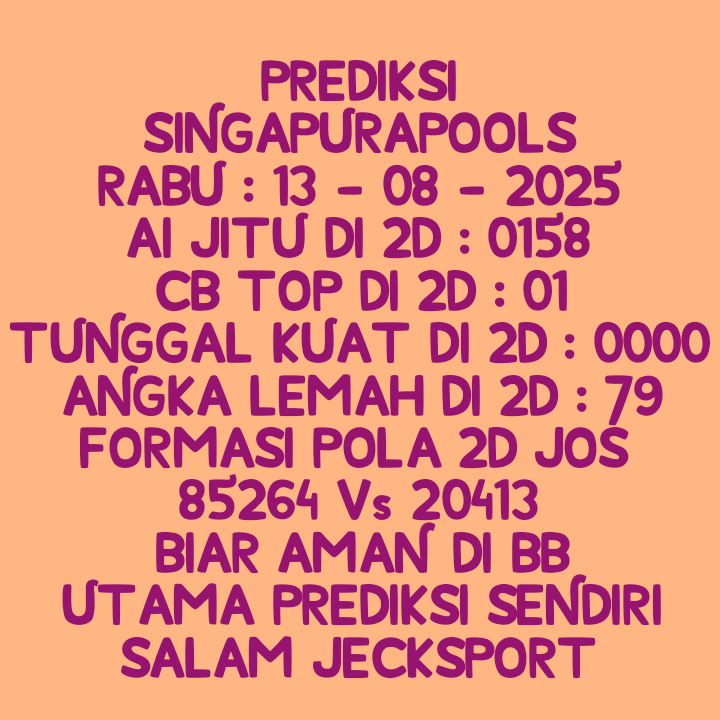 Prediksi Singapore Sabtu, 04-10-2025 Merupakan Prediksi Otomatis yang menggabungkan Metode Kalender Togel Dengan LN Generator yang akurasi prediksinya sudah kita ketahui bersama. Jadi harap Maklum Jika kadang meleset Prediksi Singapore kita. Jadikan ini sebagai perbandingan saja dan tetap Utamakan karya sendiri