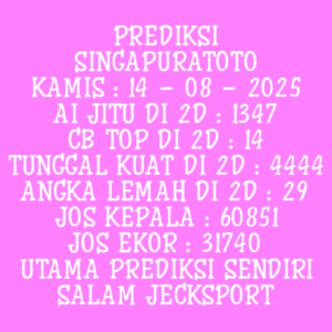 Prediksi Singapore Rabu, 01-10-2025 Merupakan Prediksi Otomatis yang menggabungkan Metode Kalender Togel Dengan LN Generator yang akurasi prediksinya sudah kita ketahui bersama. Jadi harap Maklum Jika kadang meleset Prediksi Singapore kita. Jadikan ini sebagai perbandingan saja dan tetap Utamakan karya sendiri