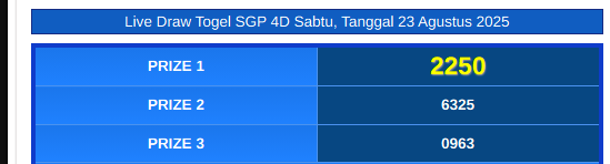 Prediksi Singapore Rabu, 01-10-2025 Merupakan Prediksi Otomatis yang menggabungkan Metode Kalender Togel Dengan LN Generator yang akurasi prediksinya sudah kita ketahui bersama. Jadi harap Maklum Jika kadang meleset Prediksi Singapore kita. Jadikan ini sebagai perbandingan saja dan tetap Utamakan karya sendiri