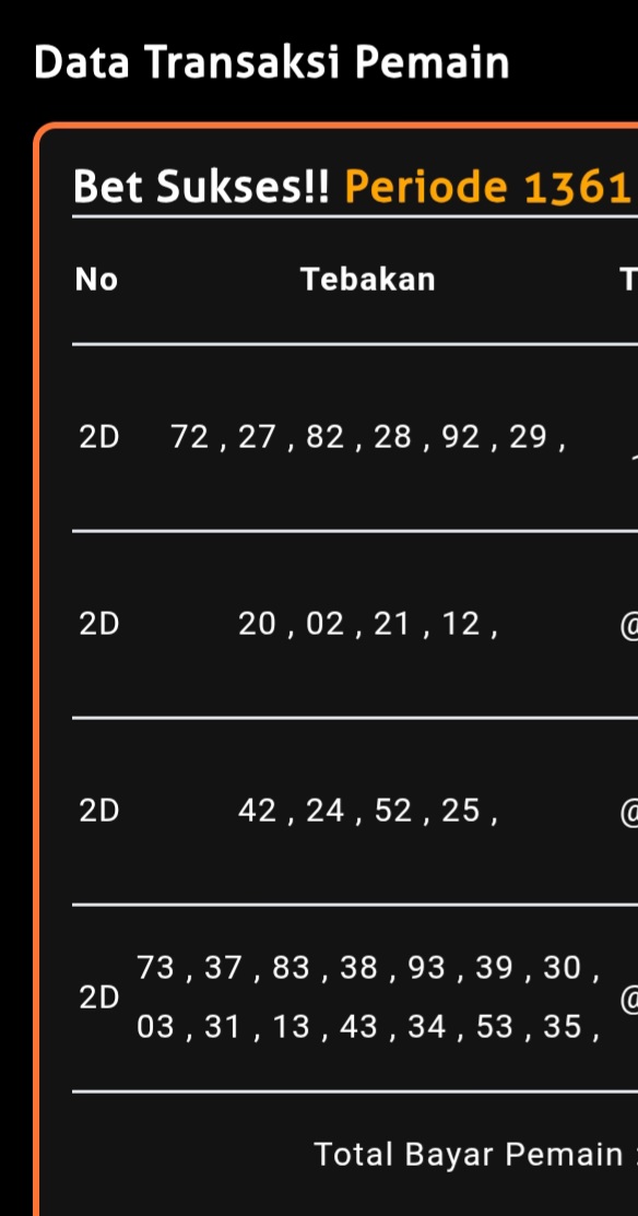 Rumus Angka Mati berdasarkan kepala harian | 04 05 06 07 08 09 10 15 16 17 18 21 26 28 29 30 31 32 41 42 43 52 53 54 64 65 72 73 75 76 83 84 86 93 94 95 96 97 98 |