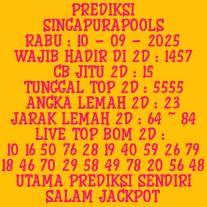 Prediksi Singapore Minggu, 28-09-2025 Merupakan Prediksi Otomatis yang menggabungkan Metode Kalender Togel Dengan LN Generator yang akurasi prediksinya sudah kita ketahui bersama. Jadi harap Maklum Jika kadang meleset Prediksi Singapore kita. Jadikan ini sebagai perbandingan saja dan tetap Utamakan karya sendiri