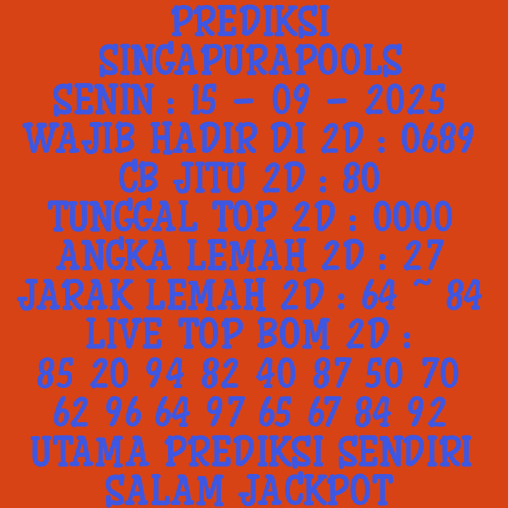 Prediksi Singapore Kamis, 02-10-2025 Merupakan Prediksi Otomatis yang menggabungkan Metode Kalender Togel Dengan LN Generator yang akurasi prediksinya sudah kita ketahui bersama. Jadi harap Maklum Jika kadang meleset Prediksi Singapore kita. Jadikan ini sebagai perbandingan saja dan tetap Utamakan karya sendiri