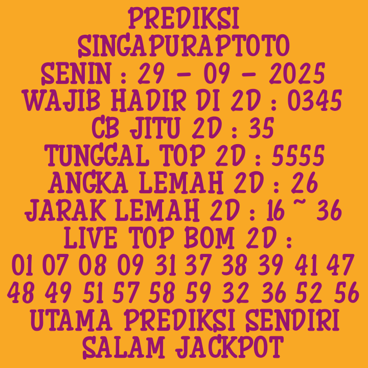 Prediksi Singapore Rabu, 01-10-2025 Merupakan Prediksi Otomatis yang menggabungkan Metode Kalender Togel Dengan LN Generator yang akurasi prediksinya sudah kita ketahui bersama. Jadi harap Maklum Jika kadang meleset Prediksi Singapore kita. Jadikan ini sebagai perbandingan saja dan tetap Utamakan karya sendiri