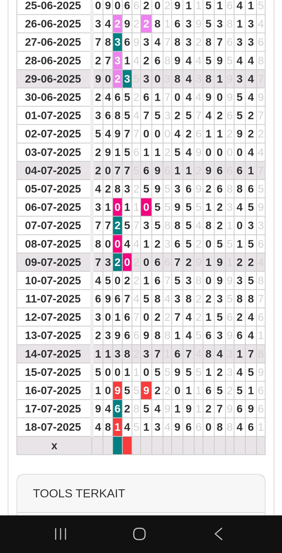 Rumus Angka Mati berdasarkan kepala harian | 07 08 09 10 18 19 20 21 29 31 32 40 42 43 49 50 51 53 60 61 62 63 64 65 71 72 73 74 75 76 82 83 84 85 87 93 95 96 98 |