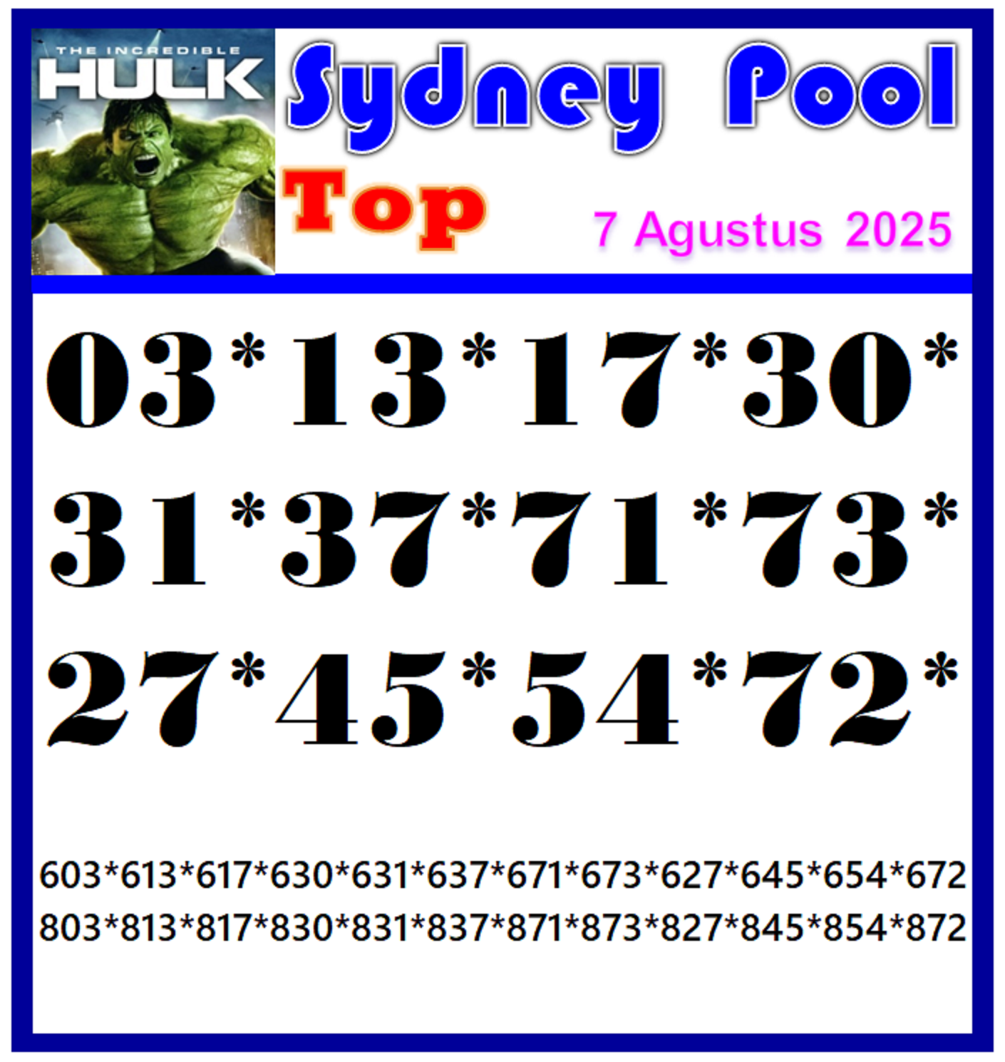 Prediksi Sydneypools Rabu, 03-09-2025 Merupakan Prediksi Otomatis yang menggabungkan Metode Kalender Togel Dengan LN Generator yang akurasi prediksinya sudah kita ketahui bersama. Jadi harap Maklum Jika kadang meleset Prediksi Sydneypools kita. Jadikan ini sebagai perbandingan saja dan tetap Utamakan karya sendiri