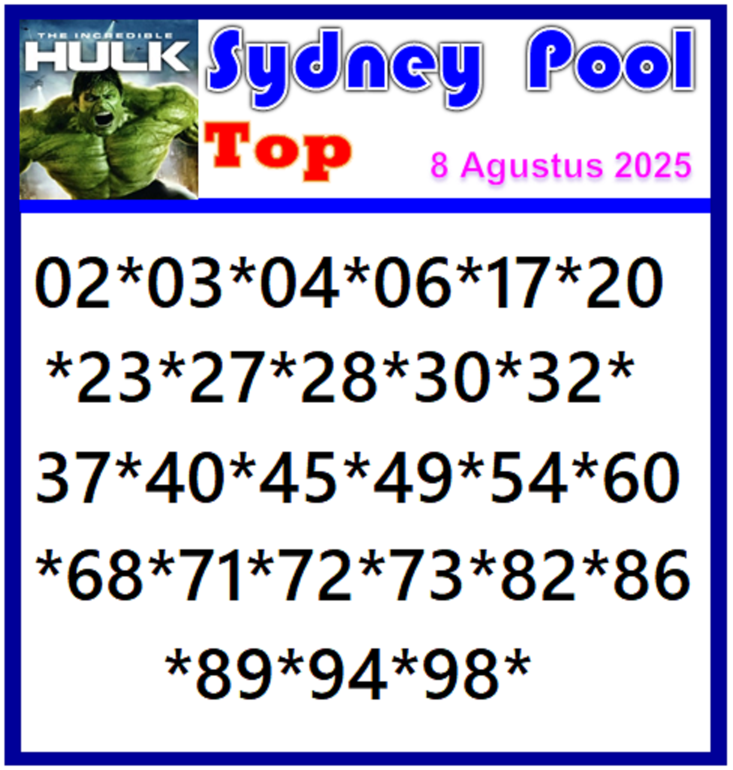 Prediksi Sydneypools Jumat, 05-09-2025 Merupakan Prediksi Otomatis yang menggabungkan Metode Kalender Togel Dengan LN Generator yang akurasi prediksinya sudah kita ketahui bersama. Jadi harap Maklum Jika kadang meleset Prediksi Sydneypools kita. Jadikan ini sebagai perbandingan saja dan tetap Utamakan karya sendiri