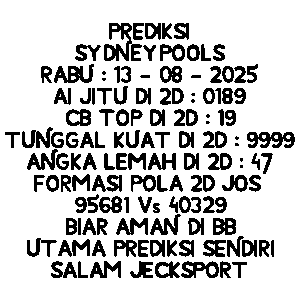 Prediksi Sydneypools Kamis, 02-10-2025 Merupakan Prediksi Otomatis yang menggabungkan Metode Kalender Togel Dengan LN Generator yang akurasi prediksinya sudah kita ketahui bersama. Jadi harap Maklum Jika kadang meleset Prediksi Sydneypools kita. Jadikan ini sebagai perbandingan saja dan tetap Utamakan karya sendiri