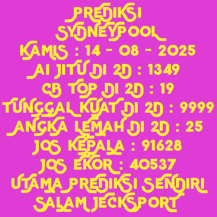 Prediksi Sydneypools Selasa, 30-09-2025 Merupakan Prediksi Otomatis yang menggabungkan Metode Kalender Togel Dengan LN Generator yang akurasi prediksinya sudah kita ketahui bersama. Jadi harap Maklum Jika kadang meleset Prediksi Sydneypools kita. Jadikan ini sebagai perbandingan saja dan tetap Utamakan karya sendiri
