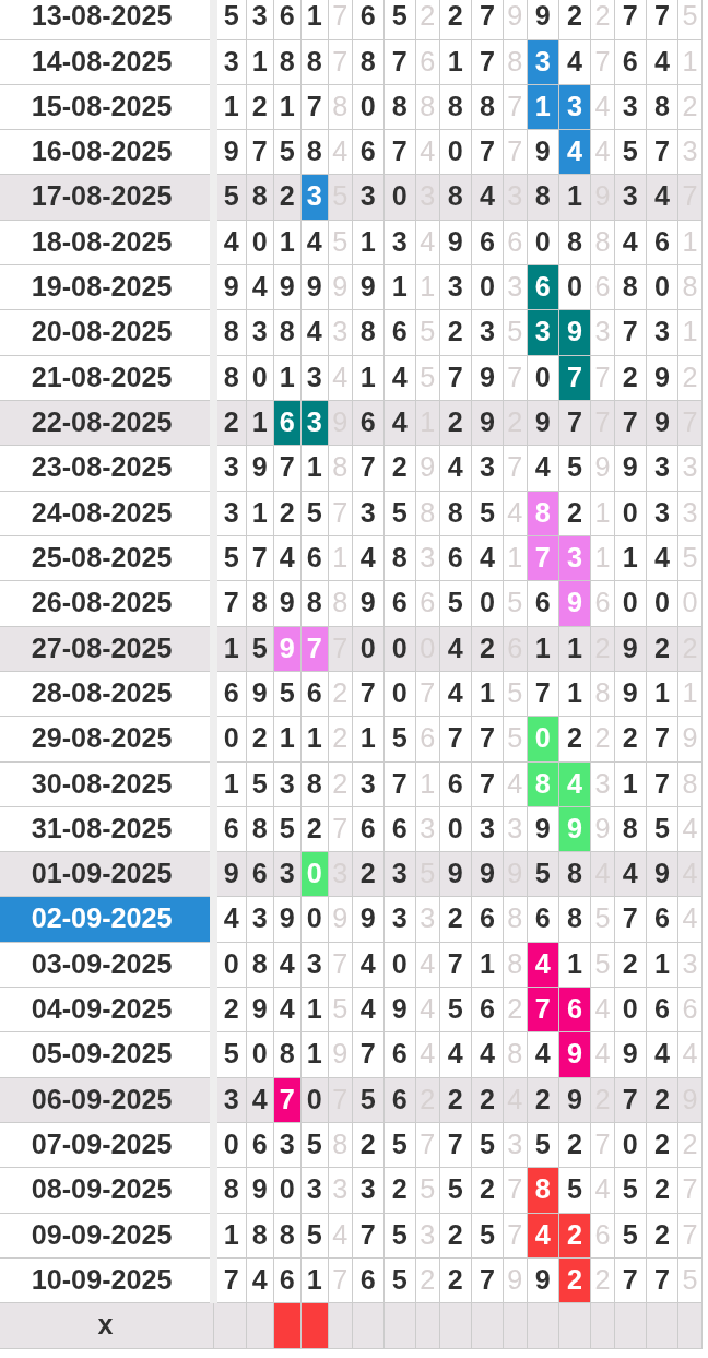 Rumus Angka Mati berdasarkan kepala harian | 07 08 09 10 19 20 21 27 28 31 38 39 40 41 42 43 48 49 50 51 52 53 54 59 60 61 62 63 65 71 73 74 76 85 86 87 96 97 98 |