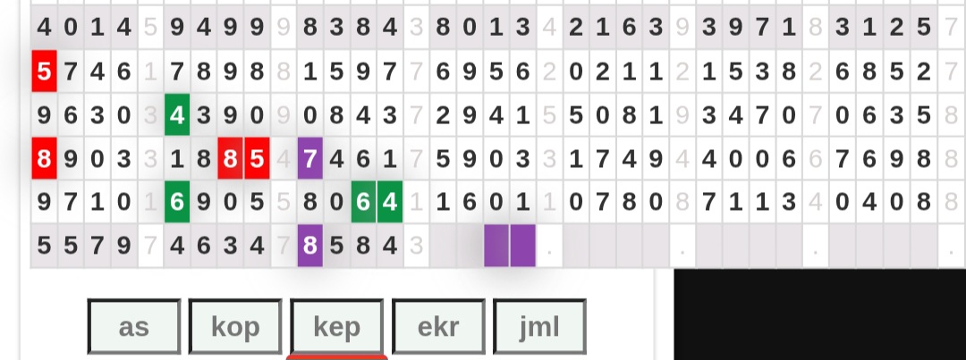 Rumus Angka Mati berdasarkan kepala harian | 04 05 06 07 08 09 10 15 16 17 18 21 26 28 29 30 31 32 41 42 43 52 53 54 64 65 72 73 75 76 83 84 86 93 94 95 96 97 98 |