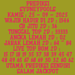 Prediksi Sydneypools Rabu, 03-09-2025 Merupakan Prediksi Otomatis yang menggabungkan Metode Kalender Togel Dengan LN Generator yang akurasi prediksinya sudah kita ketahui bersama. Jadi harap Maklum Jika kadang meleset Prediksi Sydneypools kita. Jadikan ini sebagai perbandingan saja dan tetap Utamakan karya sendiri